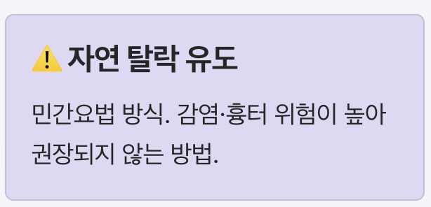 | 민간요법 | 비용 없음 | 위험성 높음 | 비추천 |