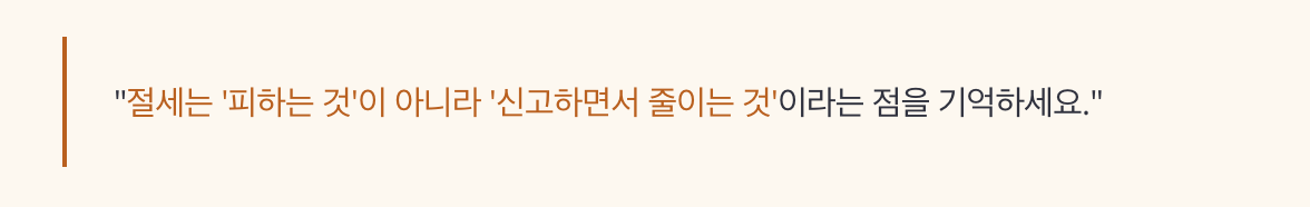즉, 절세는 '피하는 것'이 아니라 '신고하면서 줄이는 것'이라는 점을 기억하세요.
