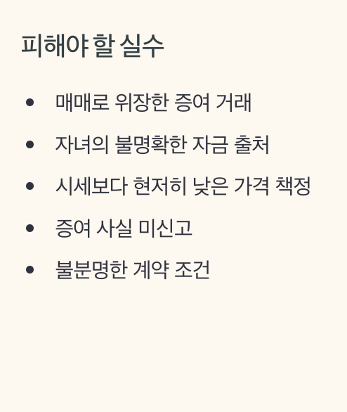 증여세 신고를 안 하고 매매로 위장하거나, 자녀의 자금 출처가 불분명하면 국세청 조사 대상이 됩니다.