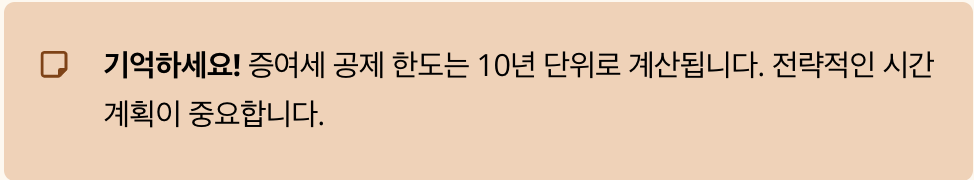 증여세 공제는 10년마다 새로 리셋됩니다. 즉, 지금 5천만원 증여하고, 10년 후 또 5천만원 증여하면 총 1억원을 세금 없이 줄 수 있는 거죠.