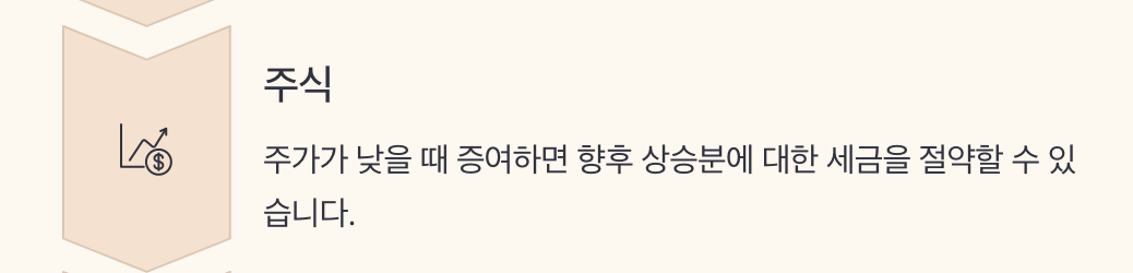 특히 주식의 경우, 향후 가치가 오를 것으로 예상된다면, 지금처럼 낮은 시점에서 증여하는 게 유리합니다.