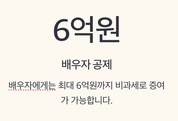 자녀에게 주는 경우, 성년 자녀는 5천만원, 미성년 자녀는 2천만원까지 비과세입니다. 배우자에게는 무려 6억원까지 가능합니다.