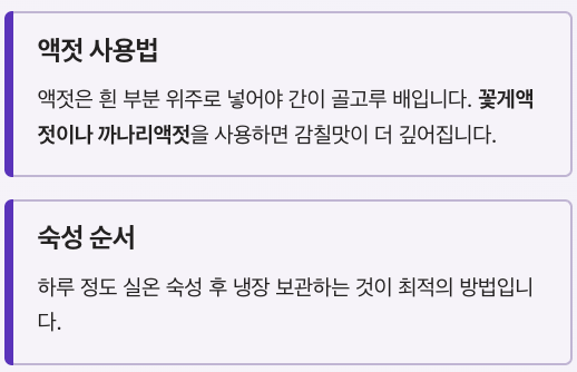 특히 액젓의 종류에 따라 맛이 달라지는데 꽃게액젓이나 까나리액젓을 사용하면 감칠맛이 더 깊어집니다.
