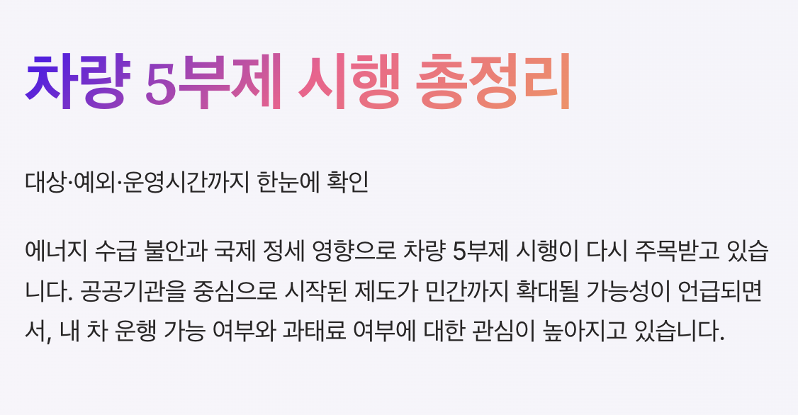 최근 에너지 수급 불안과 국제 정세 영향으로 차량 5부제 시행이 다시 주목받고 있습니다. 공공기관을 중심으로 시작된 제도가 민간까지 확대될 가능성이 언급되면서 많은 분들이 “내 차는 언제 운행 가능한지”, “과태료는 있는지” 궁금해하고 있습니다.
