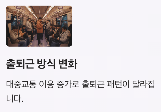 - 출퇴근 방식 변화 (대중교통 이용 증가)