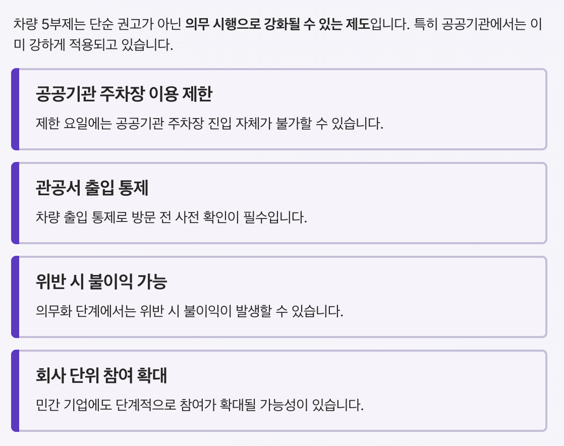 차량 5부제는 단순 권고가 아닌 의무 시행으로 강화될 수 있는 제도입니다. 특히 공공기관에서는 이미 강하게 적용되고 있습니다.