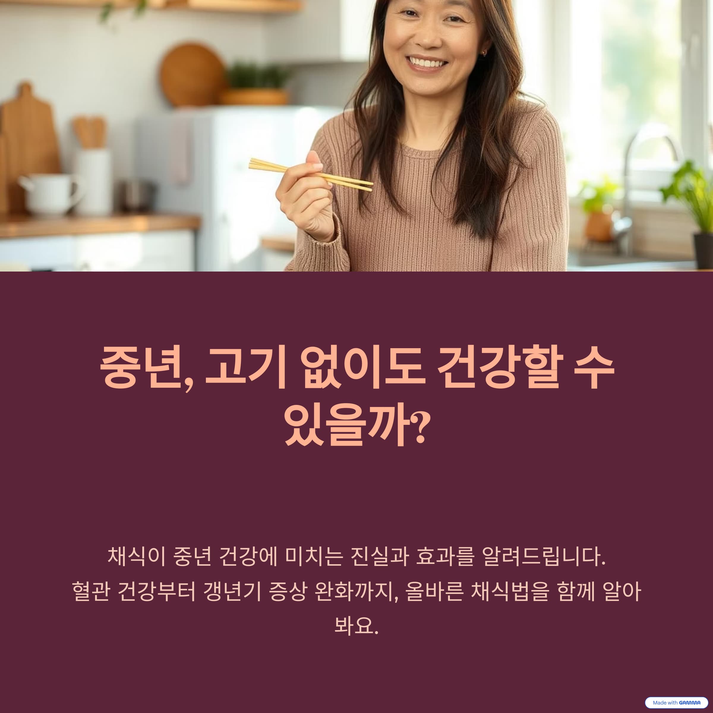 고기 없이도 충분히 건강할 수 있을까? 중년기에 접어들며 식단에 고민이 많아진 여러분께 채식의 진실을 알려드립니다.