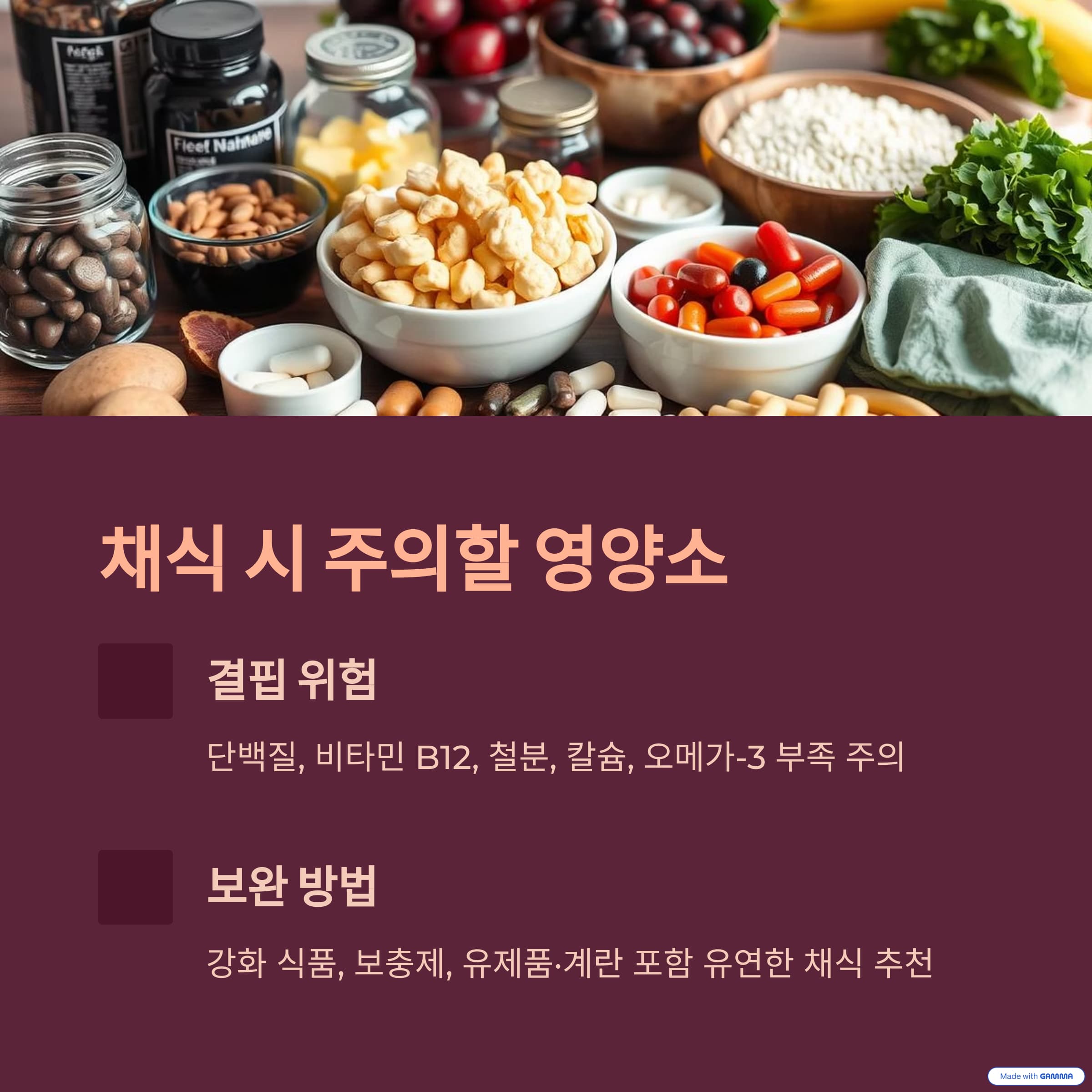 채식이 무조건 건강한 것은 아닙니다. 특히 단백질, 비타민 B12, 철분, 칼슘, 오메가-3는 결핍되기 쉬워요. 동물성 식품을 완전히 배제하면 위 영양소를 충분히 섭취하기 어렵기 때문에 강화식품이나 보충제를 통해 보완해야 합니다. 일부 유제품이나 계란을 포함하는 유연한 채식(페스코, 락토오보)도 좋은 선택이에요.