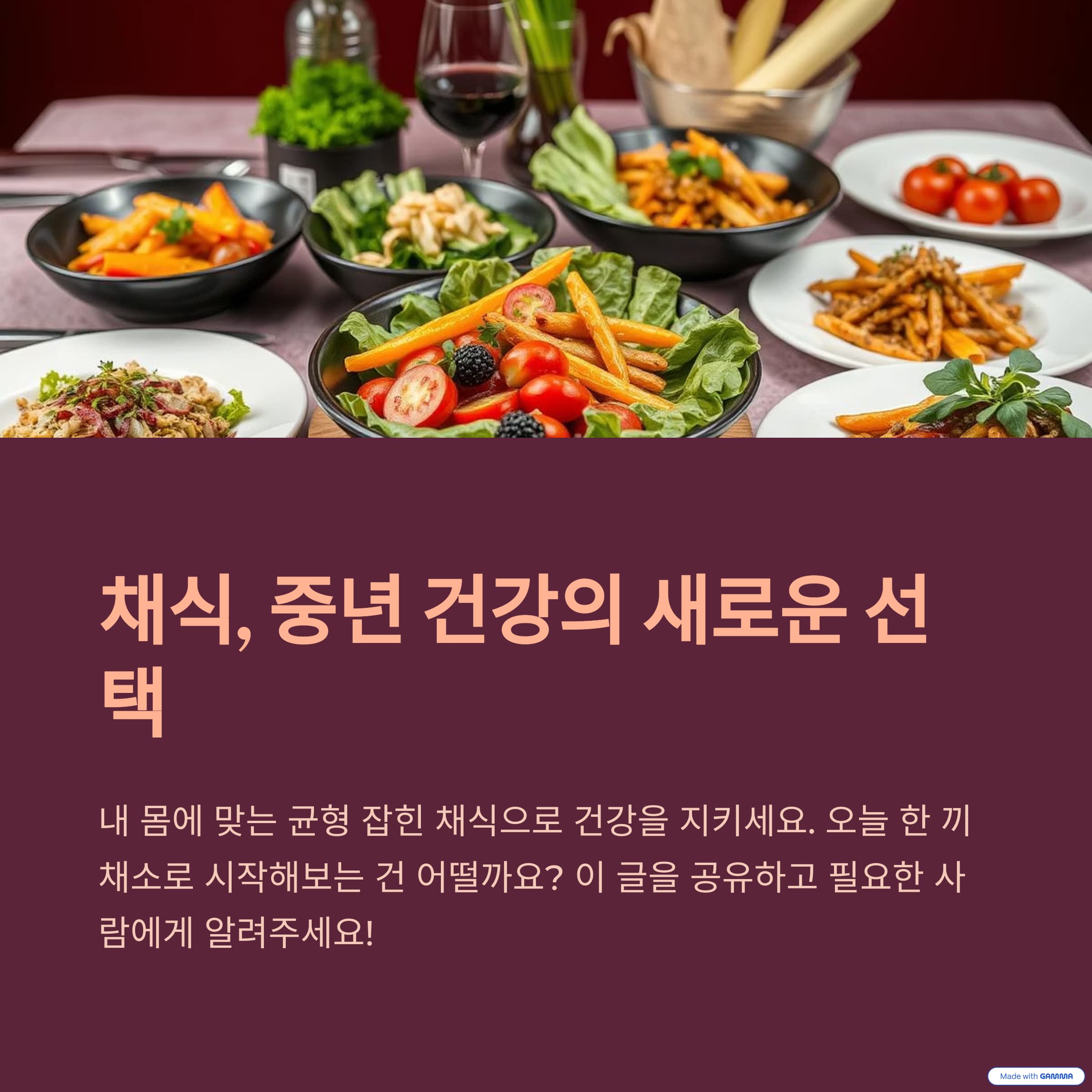 채식은 더 이상 젊은이들의 트렌드가 아니라, 중년의 건강을 위한 지혜로운 선택이 될 수 있습니다. 단, 무작정 따라 하기보다는 자신의 몸 상태와 필요한 영양소를 꼼꼼히 고려해 접근해야 해요. 중년은 ‘내 몸을 제대로 아는 식사’가 필요한 시기니까요. 여러분도 오늘 한 끼, 채소로 가볍게 시작해 보는 건 어떨까요?