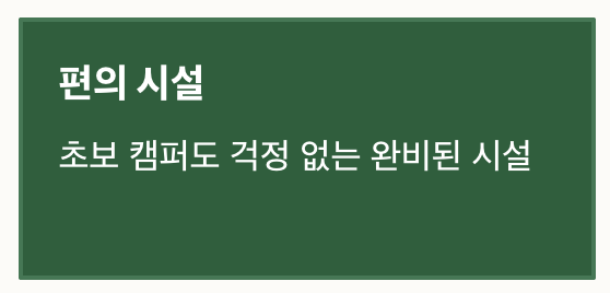 편의 시설도 잘 갖춰져 있어 초보 캠퍼도 걱정 없이 떠날 수 있어요.