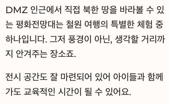 DMZ 인근에서 직접 북한 땅을 바라볼 수 있는 평화전망대는 철원 여행의 특별한 체험 중 하나입니다. 그저 풍경이 아닌, 생각할 거리까지 안겨주는 장소죠.