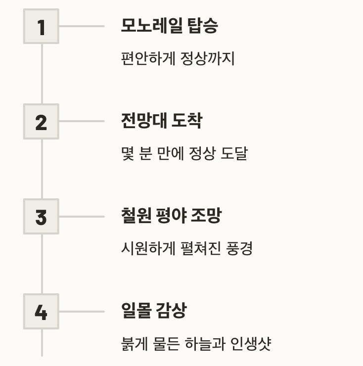 걷기 힘든 날엔 모노레일 타고 소이산 전망대로 올라가 보세요. 몇 분 안에 정상에 도착할 수 있고, 그곳에서 바라보는 철원 평야와 산세는 정말 시원하게 펼쳐집니다.