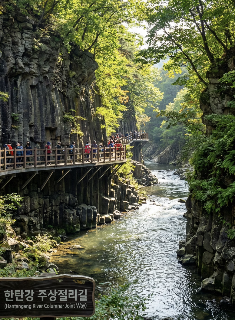 마지막으로 추천하는 철원의 하이라이트, 한탄강 주상절리길은 꼭 걸어봐야 하는 명소입니다. 절벽 위 잔도 위를 걸으며 바로 아래 흐르는 강과 현무암 주상절리를 보는 경험은 생각보다 훨씬 웅장합니다.