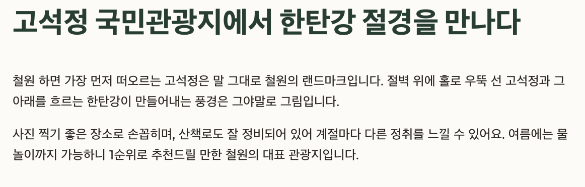 사진 찍기 좋은 장소로 손꼽히며, 산책로도 잘 정비되어 있어 계절마다 다른 정취를 느낄 수 있어요. 여름에는 물놀이까지 가능하니 1순위로 추천드릴 만한 철원의 대표 관광지입니다.