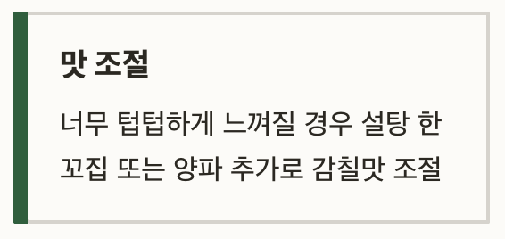 - 너무 텁텁하게 느껴질 경우 설탕 한 꼬집 또는 양파 추가로 감칠맛 조절