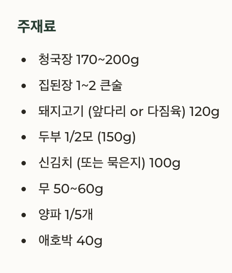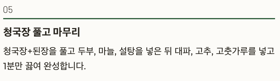 | 끓이는 시간 | 청국장 넣은 후 5분 이내로 짧게 |