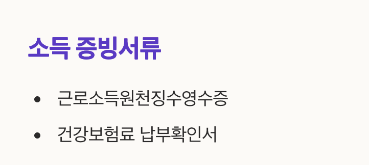 | 소득 증빙서류 | 근로소득원천징수영수증, 건강보험료 납부확인서 등 |