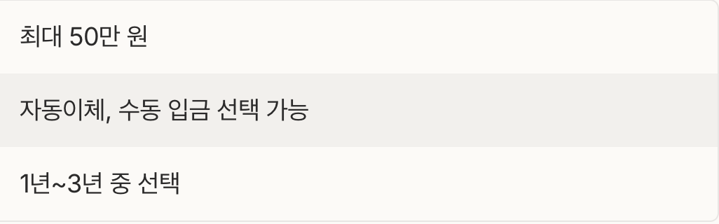 | 납입 방식 | 자동이체, 수동 입금 선택 가능 |
