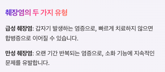 | 동반 증상 | 발열, 식욕 감소, 복부 팽만 |