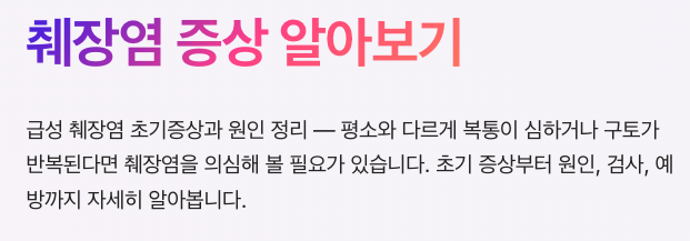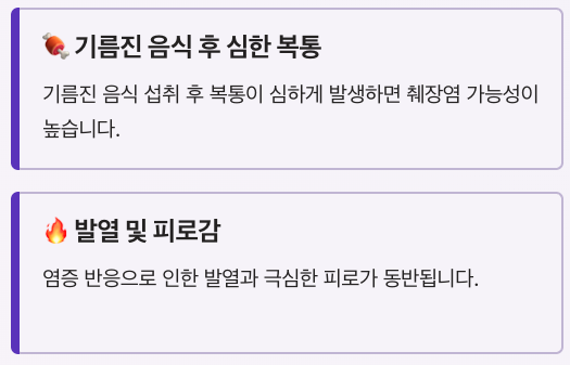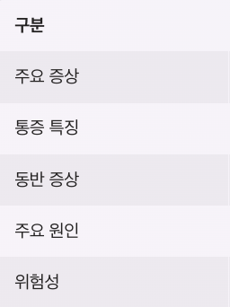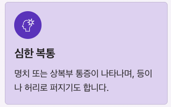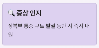 | 주요 증상 | 상복부 통증, 구토, 메스꺼움 |