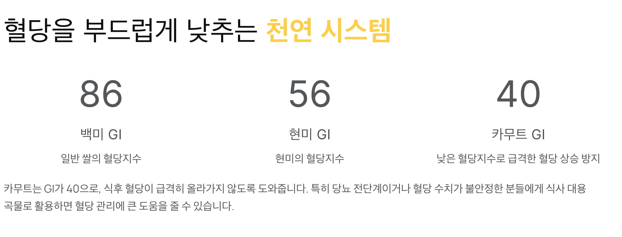 카무트가 가장 각광받는 이유는 바로 낮은 혈당지수(GI)입니다.