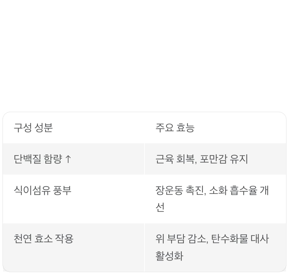 | 단백질 함량 ↑ | 근육 회복, 포만감 유지 |