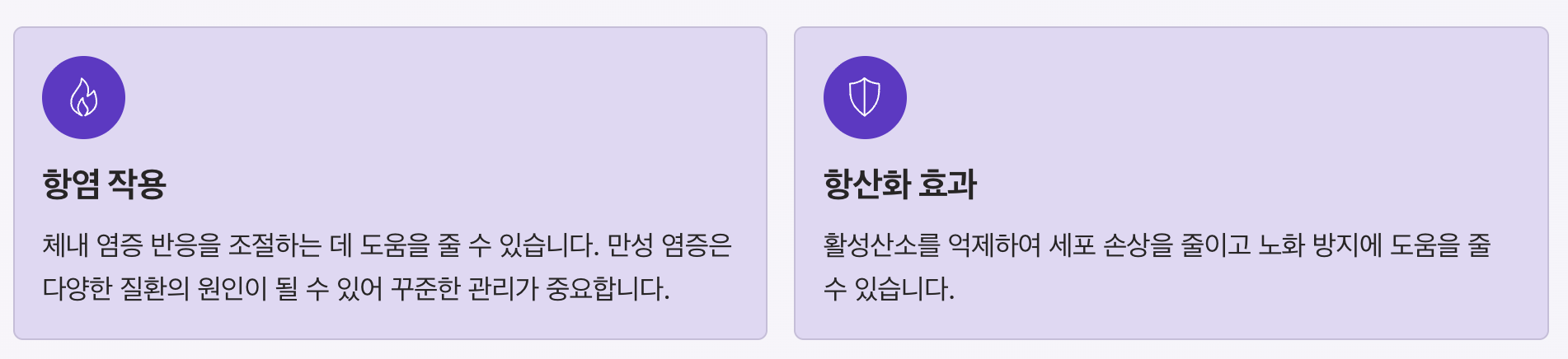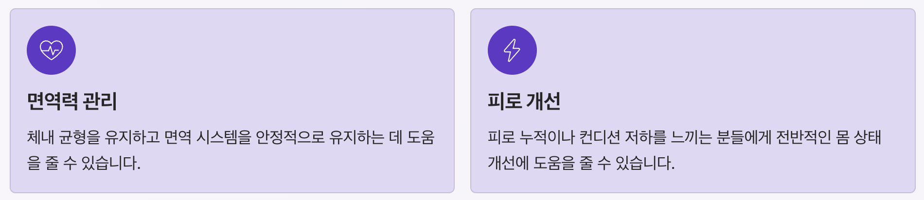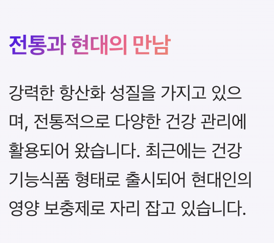 | 주요 효능 | 항염, 항산화, 면역 관리, 피로 개선 | 전반적인 건강 관리 |