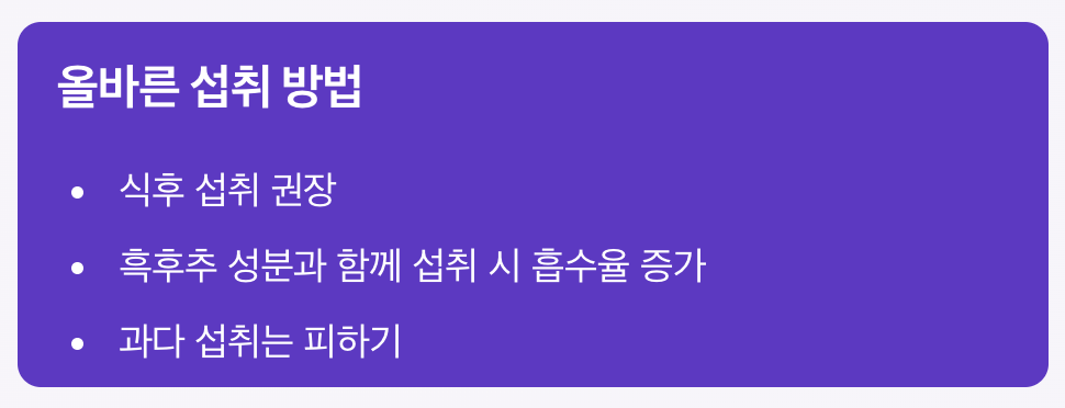 | 섭취 타이밍 | 식후 섭취 권장 | 흡수 효율 증가 |