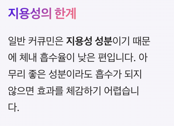 일반 커큐민은 지용성 성분이기 때문에 체내 흡수율이 낮은 편입니다. 즉, 아무리 좋은 성분이라도 흡수가 되지 않으면 효과를 체감하기 어렵습니다.