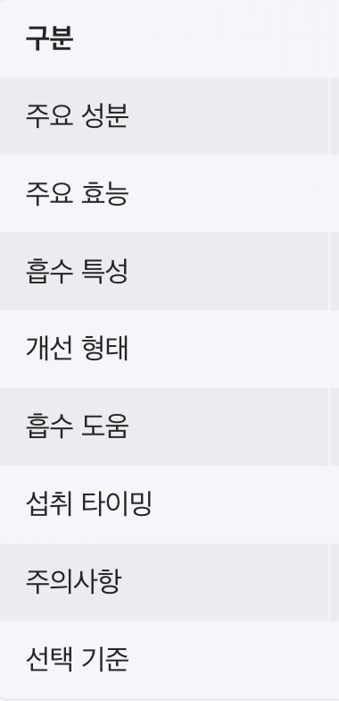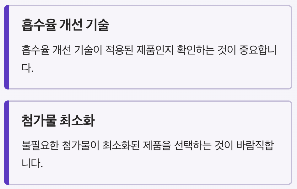 | 선택 기준 | 흡수율, 형태, 성분 조합 | 제품 선택 중요 |