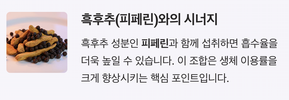 또한 흑후추 성분(피페린)과 함께 섭취하면 흡수율을 더욱 높일 수 있다는 점도 중요한 포인트입니다.