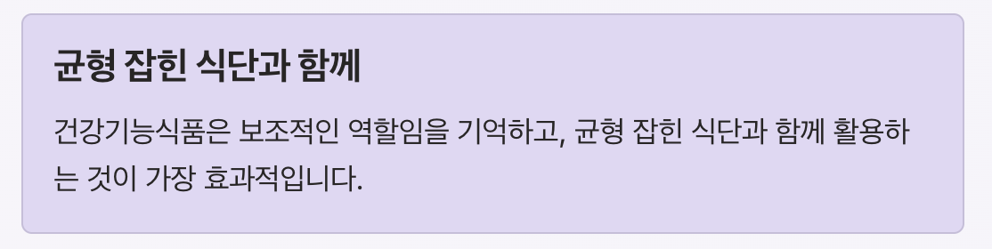 건강기능식품은 어디까지나 보조적인 역할이라는 점을 기억하고, 균형 잡힌 식단과 함께 활용하는 것이 가장 효과적인 방법입니다.