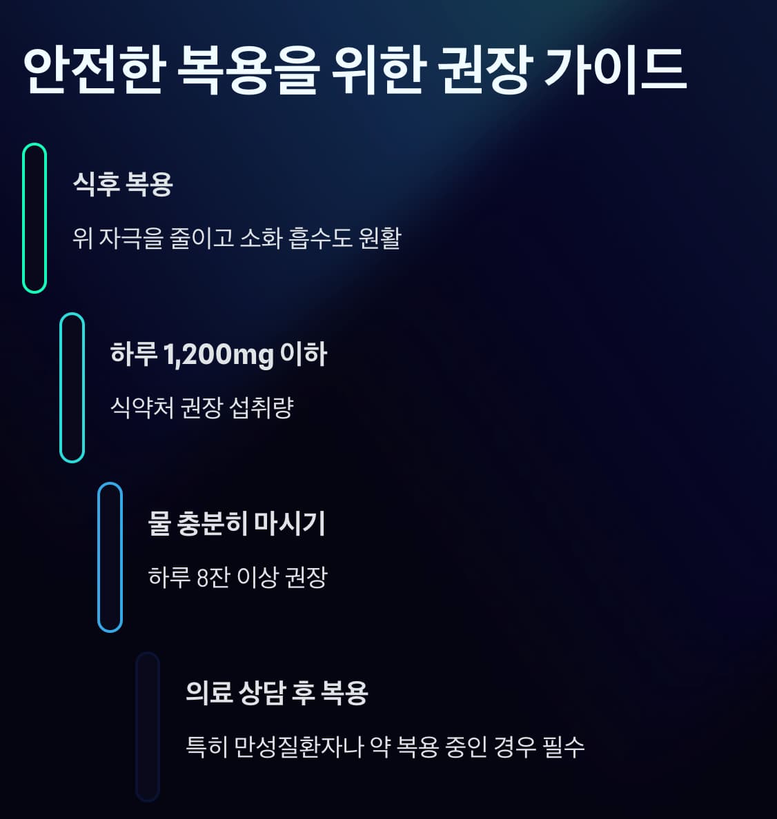 - 식후 복용: 위 자극을 줄이고 소화 흡수도 원활