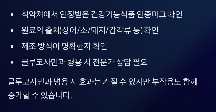 원료의 출처(상어/소/돼지/갑각류 등)와 제조 방식이 명확한지 확인하세요.