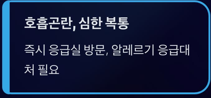 | 호흡곤란, 심한 복통 | 즉시 응급실 방문, 알레르기 응급대처 필요 |