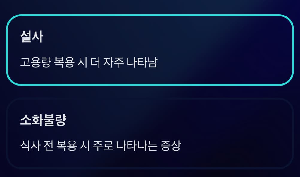 | 소화불량 | 식사 전 복용 시 주로 나타나는 증상 |