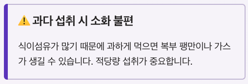식이섬유가 많기 때문에 과하게 먹으면 복부 팽만이나 가스가 생길 수 있습니다.