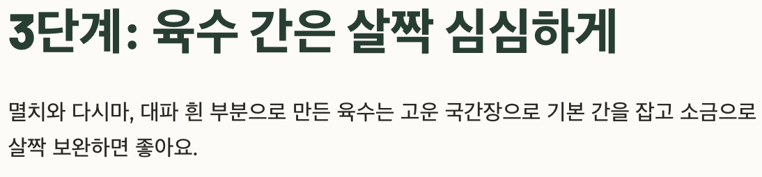| 3단계 | 간 맞추기 | 국간장+소금, 살짝 심심하게 |