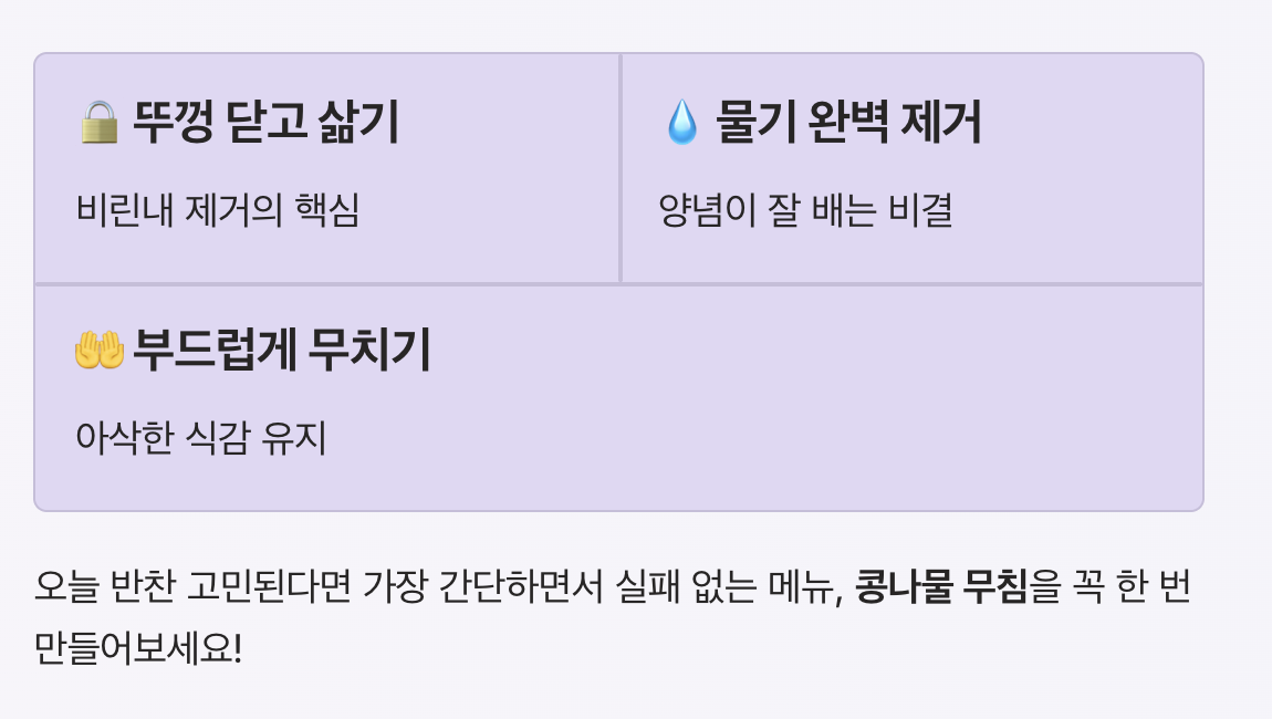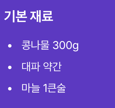| 하얀 콩나물무침 | 담백, 깔끔 | 기본 반찬 |