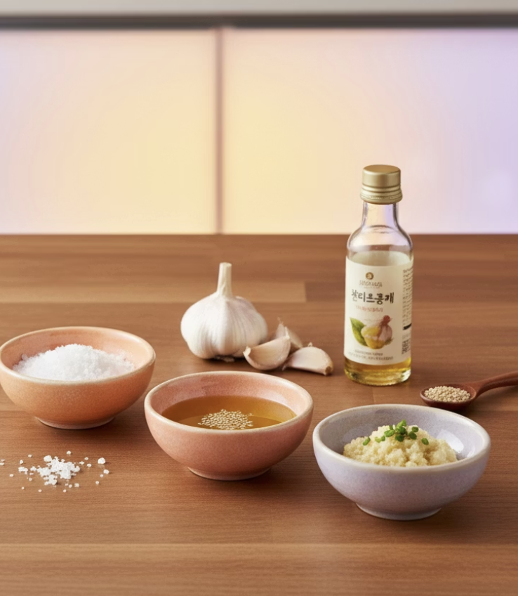 - 소금, 마늘, 참기름, 깨소금 넣기