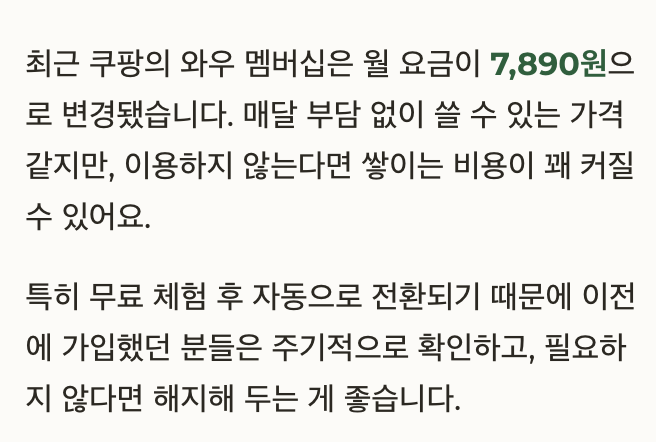 최근 쿠팡의 와우 멤버십은 월 요금이 7,890원으로 변경됐습니다.