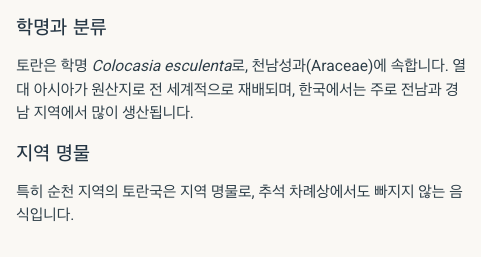 특히 순천 지역의 토란국은 지역 명물로, 추석 차례상에서도 빠지지 않는 음식입니다.