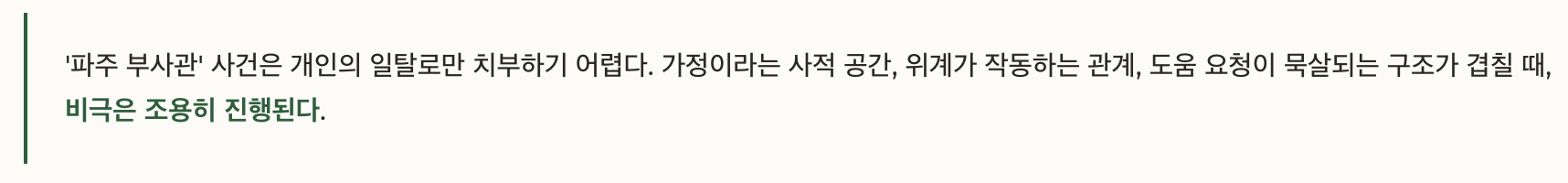 2025년 11월, 경기도 파주에서 발생한 이른바 ‘파주 부사관 아내 사망 사건’은 단순한 가정 내 비극을 넘어, 방치·침묵·관계의 단절이 어떤 결과를 낳는지를 극명하게 보여준 사건이다.