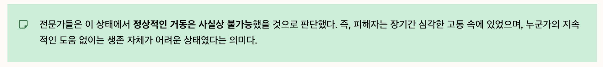 전문가들은 이 상태에서 정상적인 거동은 사실상 불가능했을 것으로 판단했다. 즉, 피해자는 장기간 심각한 고통 속에 있었으며, 누군가의 지속적인 도움 없이는 생존 자체가 어려운 상태였다는 의미다.