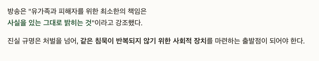 진실 규명은 처벌을 넘어, 같은 침묵이 반복되지 않기 위한 사회적 장치를 마련하는 출발점이 되어야 한다.