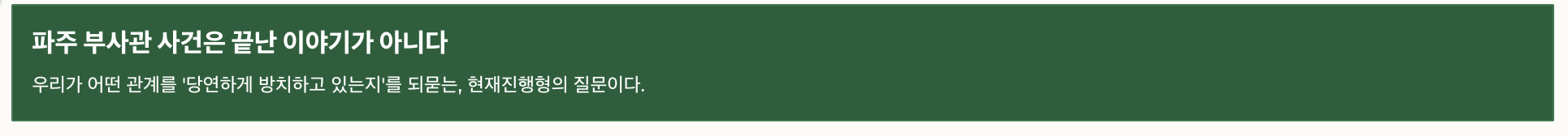 우리가 어떤 관계를 ‘당연하게 방치하고 있는지’를 되묻는, 현재진행형의 질문이다.