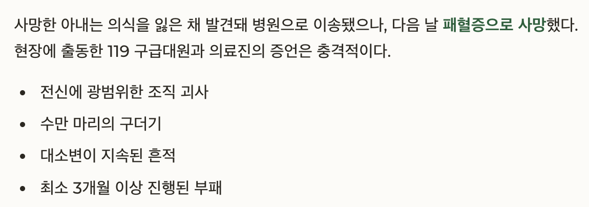 • 구급대원 증언: “남편이 3개월 전부터 구더기가 나왔다고 말했다”