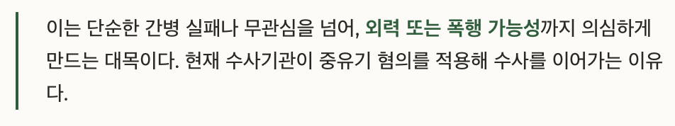 이는 단순한 간병 실패나 무관심을 넘어, 외력 또는 폭행 가능성까지 의심하게 만드는 대목이다. 현재 수사기관이 중유기 혐의를 적용해 수사를 이어가는 이유다.
