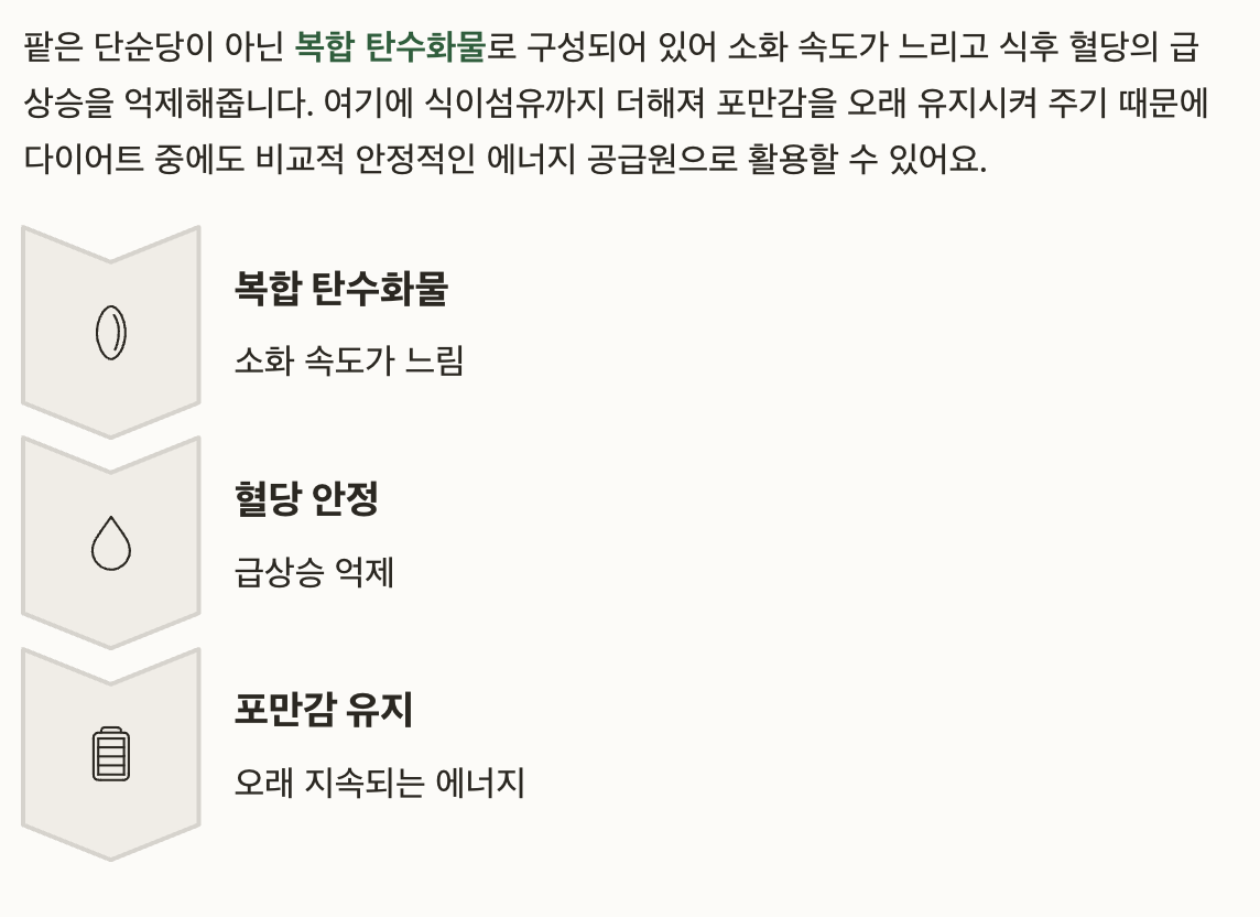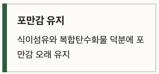 | 포만감 유지 | 식이섬유와 복합탄수화물 덕분에 포만감 오래 유지 |