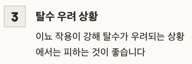 - 이뇨 작용이 강해 탈수가 우려되는 상황에서는 피하는 것이 좋습니다
